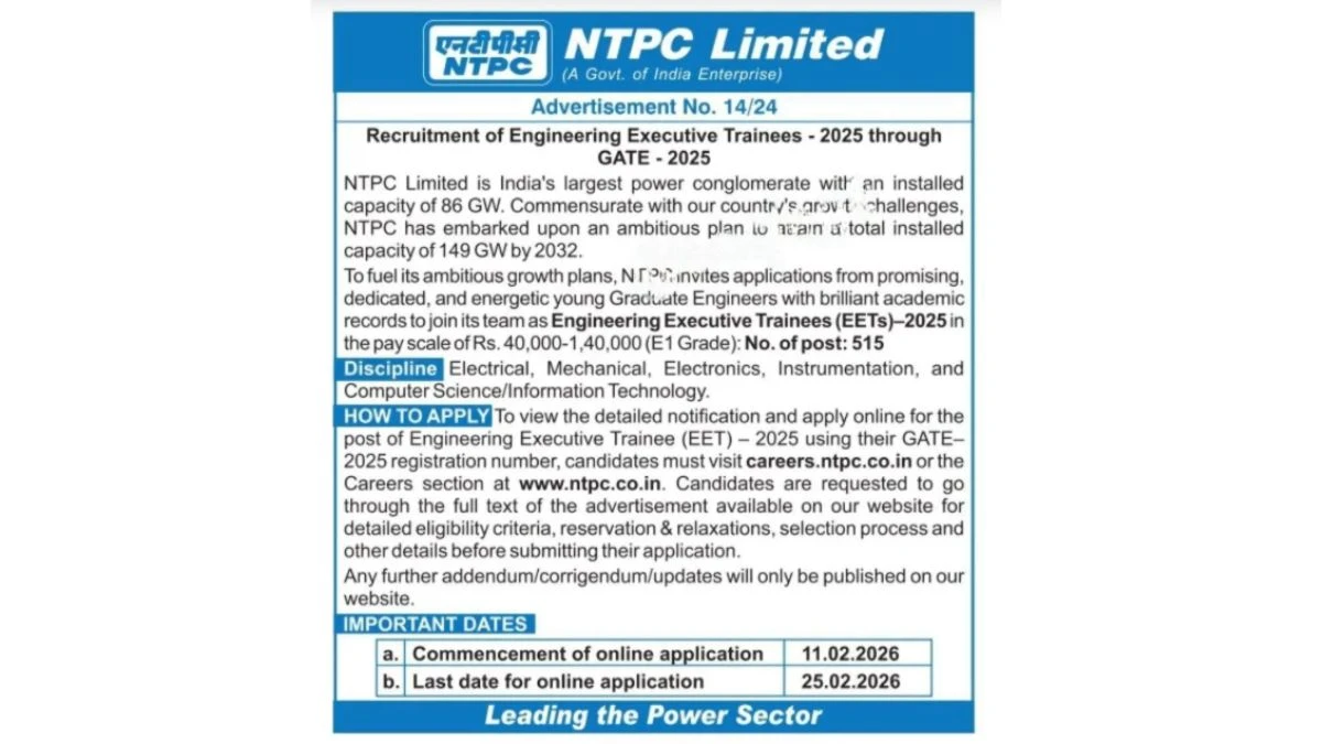 NTPC Limited, India’s largest power conglomerate with an installed capacity of 86 GW, has issued a notice for the NTPC Recruitment for Engineers 2026. The company has undertaken an ambitious plan to attain a total installed capacity of 149 GW by 2032. To meet this growing requirement, they invites applications for the NTPC Graduate Engineer Trainee Vacancy in its E1 Grade pay scale. This is a golden opportunity for job aspirants who are looking for PSU jobs and high-profile Government Jobs for Engineers in India through the NTPC EET through GATE 2026 path. Eligible candidates are required to complete the online registration within the timeline so that their candidature is considered in this prestigious national recruitment drive.