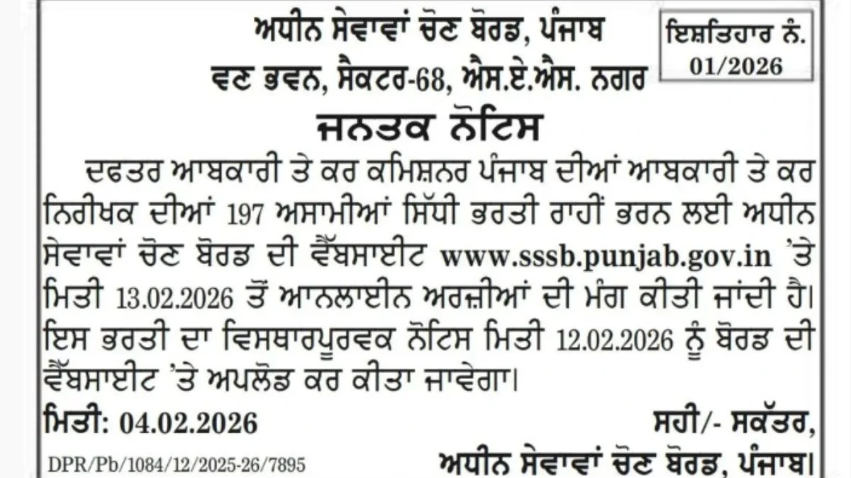 Subordinate Services Selection Board, Punjab has officially announced staff selection board recruitment in the year 2026. The given notification singles out the Punjab SSSB Excise and Taxation Inspector Jobs 2026, as it can provide a person with an excellent chance to find a stable job in the administration of this state. The board seeks to recruit 197 vacancies with the Excise and Taxation Inspector Recruitment Punjab 2026, where recruitment is done by direct means. Those candidates who show interest in the Punjab SSSB Online Application 2026 will be able to initiate their registration using the official portal on February 13, 2026. There are super benefits and development of Government Jobs in Punjab, as all the information is on the board website by February 12, 2026.